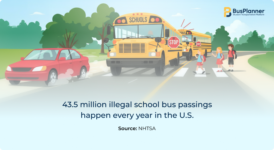- In the 2022‑2023 school year, the National Association of State Directors of Pupil Transportation Services estimated there were 43.5 million illegal passings of stopped school buses in the U.S.