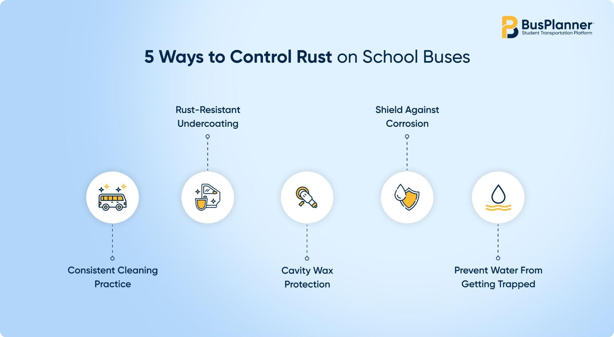 Corrosion causes major damage and expense for vehicles, affecting performance and appearance. Now that we understand how it forms and spreads, let’s explore how to prevent your school buses from rusting.