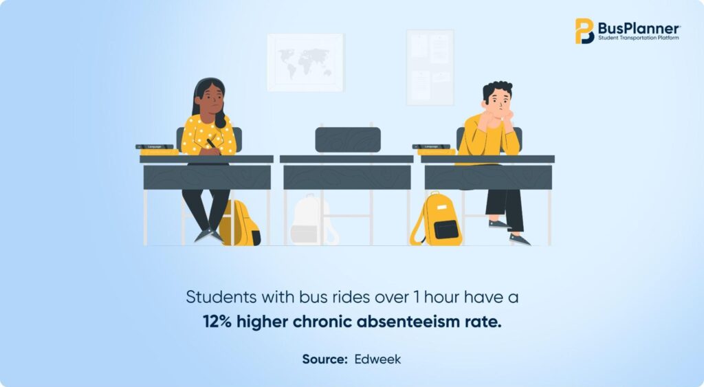 Long bus rides can take a toll on students. They’re linked to higher absenteeism, making school buses less attractive to families. A study of over 120,000 New York City students found that those with very long rides (over one hour) had a 12% chronic absenteeism rate.