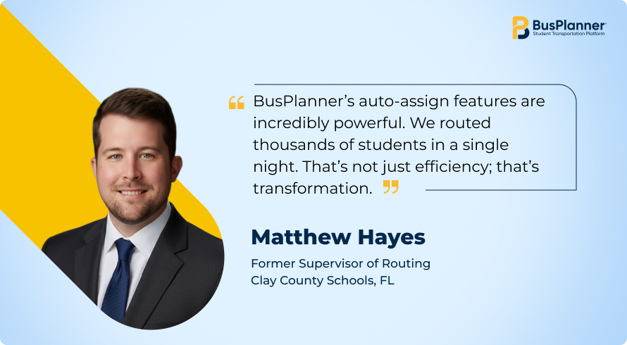 In this blog, Gustavo Munoz, Solutions Consultant at BusPlanner, and Matthew Hayes, Former Supervisor of Routing for Clay County Schools, Florida, explain how data-driven insights, proactive planning, and technology help shorten ride times and improve operations.
