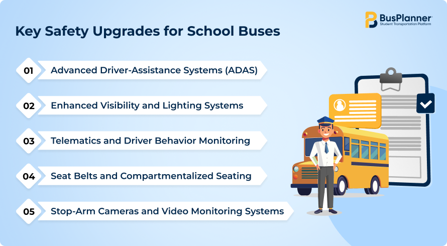 Modern school buses should include advanced driver-assistance systems (ADAS), stop-arm cameras, LED lighting, seat belts or compartmentalized seating, and telematics. These tools help prevent accidents, improve visibility, and protect students both inside and outside the bus.