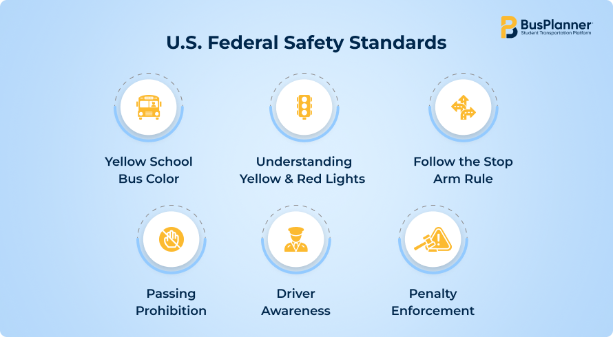 School bus laws across the United States and Canada are designed to protect students as they board and exit buses safely. These regulations aim to prevent accidents, and breaking them results in fines or other legal action. Below are the U.S. federal safety standards each school bus must follow: